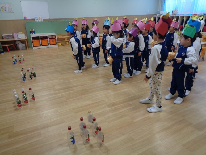 次に豆まき遊びをしました。ペットボトル鬼に向かって「鬼は外!福は内!と言いながらボールを投げます!ひよこ組さんは少し難しそうでしたが、一生懸命ボールを投げてくれていました✨