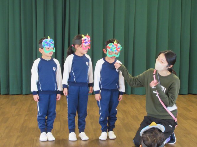4.5歳クラスはホールに集まって行いました。まず最初に、各クラス鬼のお面制作をどのように作ったかインタビューをしました🎤みんなの前に出てもしっかりと答えてくれていて感心しました