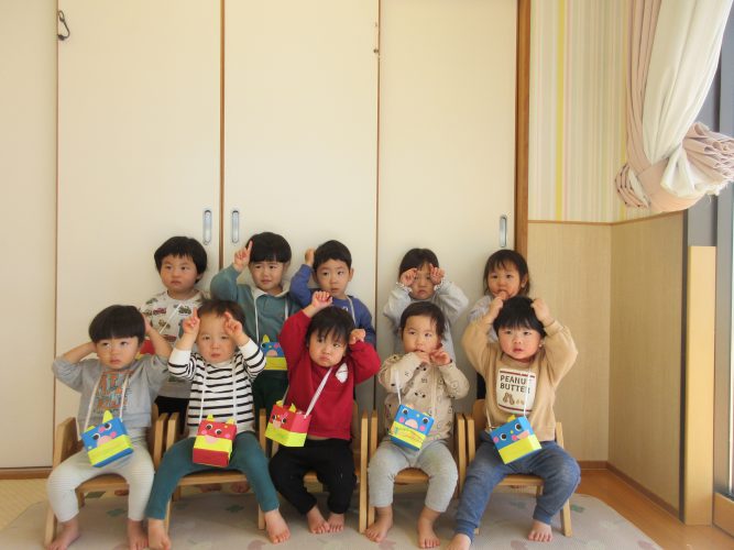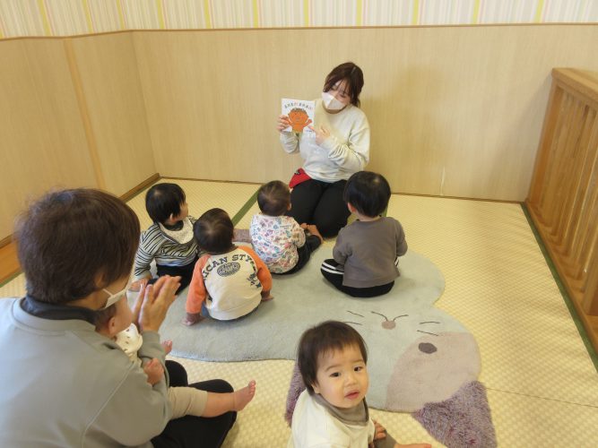 0.1歳クラスでは節分の絵本を見た後に「まめまき」のお歌をうたいました♪お歌がわからなくても、音楽に合わせて身体を揺らしたり、豆をまく動きを真似したりして楽しそうにしていましたよ