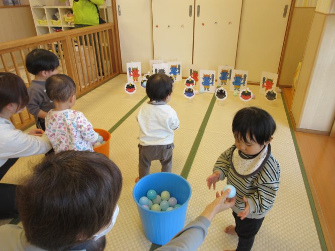 すると鬼がホールに👹・・・優しい先生鬼だったので、みんなで豆まき(ボール)をして遊びましたよ!子どもたちから「鬼は外!福は内!」と元気いっぱいな声が聞こえてきました