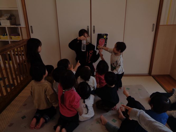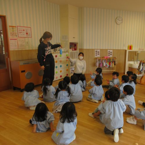 2歳児ではお楽しみ会でした。こちらも色水マジックで、透明の水が入ったペットボトルを子どもたちが順番で振って参加しました🎵「すごいねぇ」「なんでー?」と興味津々でしたよ!