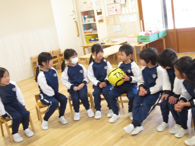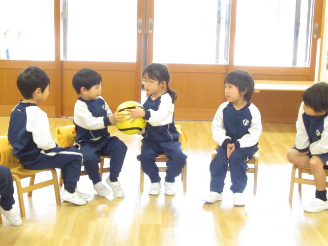 お楽しみは「爆弾ゲーム💣」をしました。タイマーの制限時間の中で、ボールを回しながらしりとりをしていきます。答えにつまってしまうと周りから「~があるよ」と内緒のヒントをもらって次々ボールを回していき...時間が来たらみんなで「どかーん💨」といって大盛り上がりでした🎵