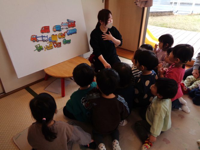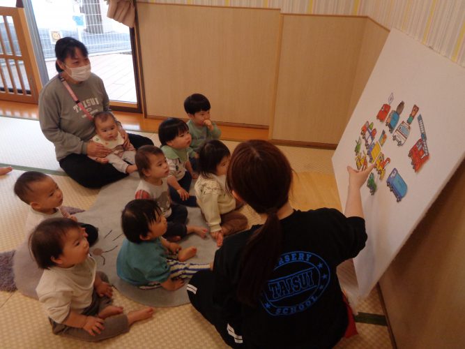 0・1歳児はお楽しみ会で、「はたらくくるま」のパネルシアターを見ました🚗普段から歌っている子どもたちも大好きな歌に合わせて、次々と車が出てきました!車の名前を言ったり、指を差したりしてノリノリで楽しんでいましたよ🎵