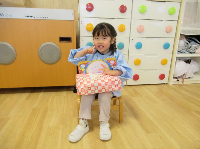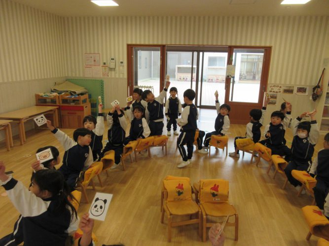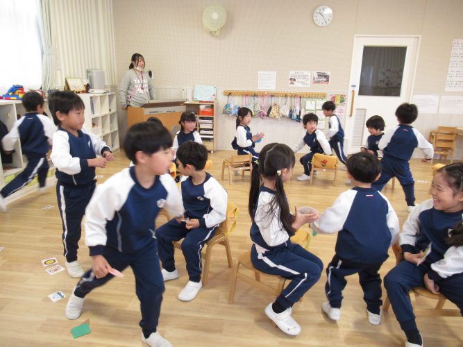 4・5歳児ではお誕生日のお友だちのお祝いをして、椅子取りゲームをしました。いつもと違うルールで、曲の終わりに保育者からお題が出されるとそれに合ったカードを拾って椅子に座ります。”生き物””かたち”などお題をよく聞いて座り、座れなかった子は一回お休み。次の回には復活してゲームに参加できるのでもう一回もう一回!とみんなが楽しめたゲームになりました🎵