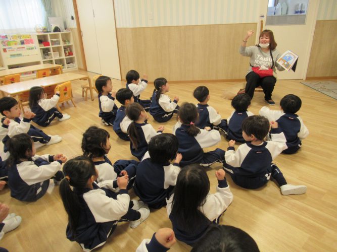 2.3歳児はお誕生日のお友だちをお祝いして、お楽しみはスケッチブックシアター「ゴー!ゴー!ドライブ!」を見ました(*^-^*)運転する真似っこをしながらスケッチブックをめくるとシルエットが出てきます。「~だぁ!」「これはなにかな?」とお友だちと話す子も😄最後には大きなケーキが出てきてみんなで食べました🍰右や左、ブレーキなどの掛け声に合わせて体を揺らし大盛り上がりでした!