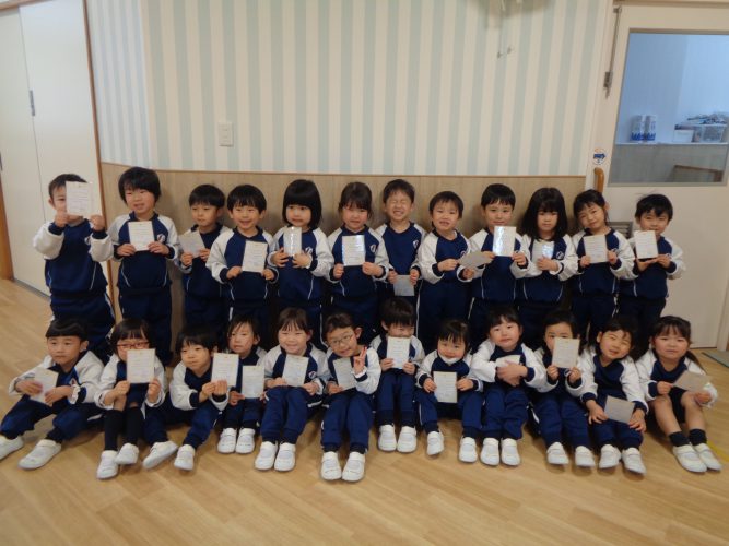 2・3歳児は先生手作りのがんばりましたメダルや賞状を一人ひとりもらい、友だちと見せ合いっこをして喜んでいました😄一年間で出来るようになったこと、たくさん遊んだことを振り返り、きっとみんなの自信になったと思います✨