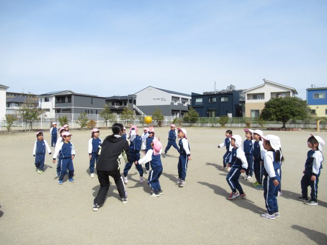 5歳児はクラスで何がしたいかアンケートをとり、ドッジボールに決定!チームに分かれて対決しました。勝って嬉しい、負けて悔しい、でも楽しかった~と満足気な子どもたちです。