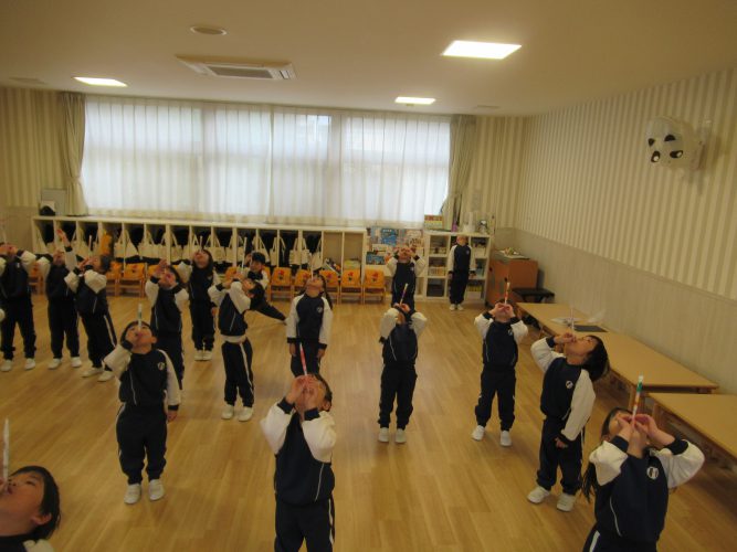 4歳児は吹き矢おもちゃを作り、みんなで一斉に飛ばして遊びました。簡単に作れて友だちとどっちが高く飛ぶか競争して楽しみました🎵