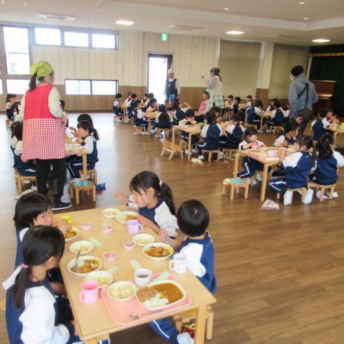 そして4・5歳児はホールでお別れ会食。2クラスが一緒に食べると大賑わいで、いつもよりおいしいねの声が聞こえてきましたよ!