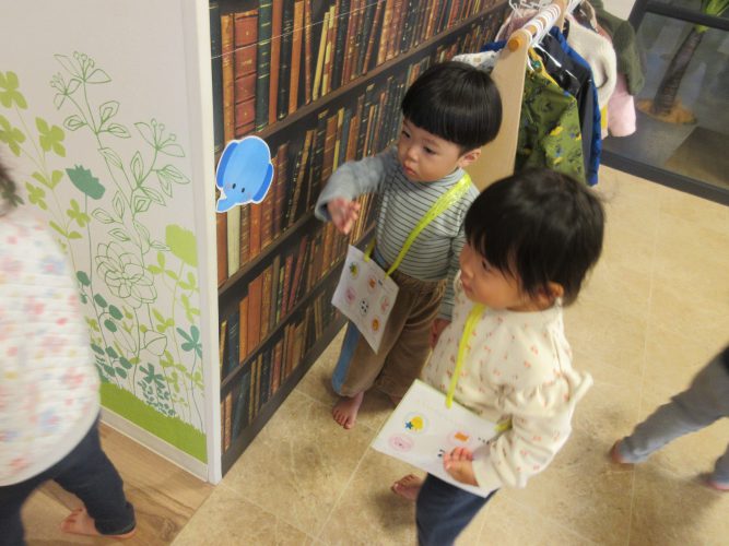 0・1歳児は園内ウォークラリーで色々な所にいる動物さんを探します。「あった~!」「ぞうさん🐘」とワイワイしながら見つけるとシールをカードに貼りました!全部集めてとっても楽しんでいましたよ🎵