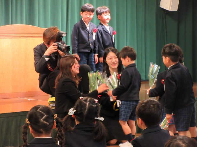 サプライズで子どもたちからお花が渡され、一人ひとりに声を掛けながら受け取りとても喜んでいた先生たちです(*^^*)終わってからも友だちや先生たちと写真をたくさん撮り和やかに式を終了しました。