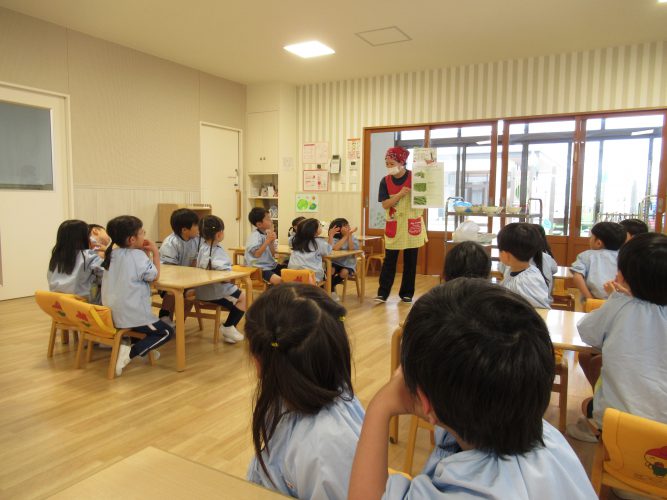 給食の先生からさやえんどうには3種類あること、すじとりの仕方を教えてもらうと「食べたことあるー!」「できるかな?」など話す子どもたち(^^)