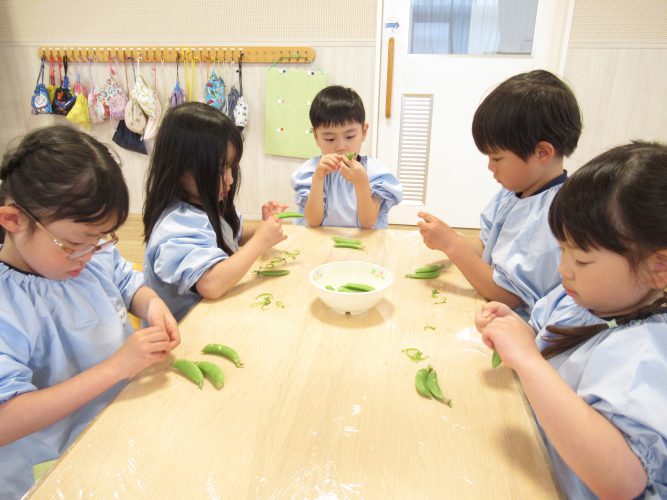 【たいすいノースこども園】クッキング『スナップエンドウのすじとり』をしました(5歳児)
